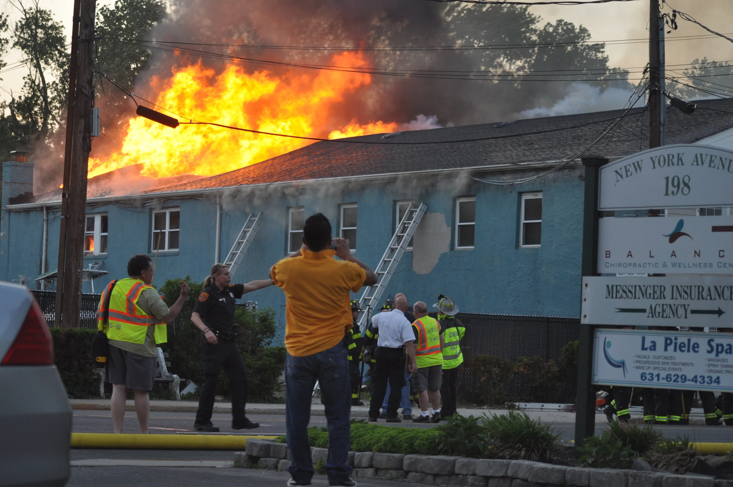 /Firefighters swarmed on a Huntington village office building Tuesday evening after a two-story office building at 191 New York Ave. was devoured by flames.