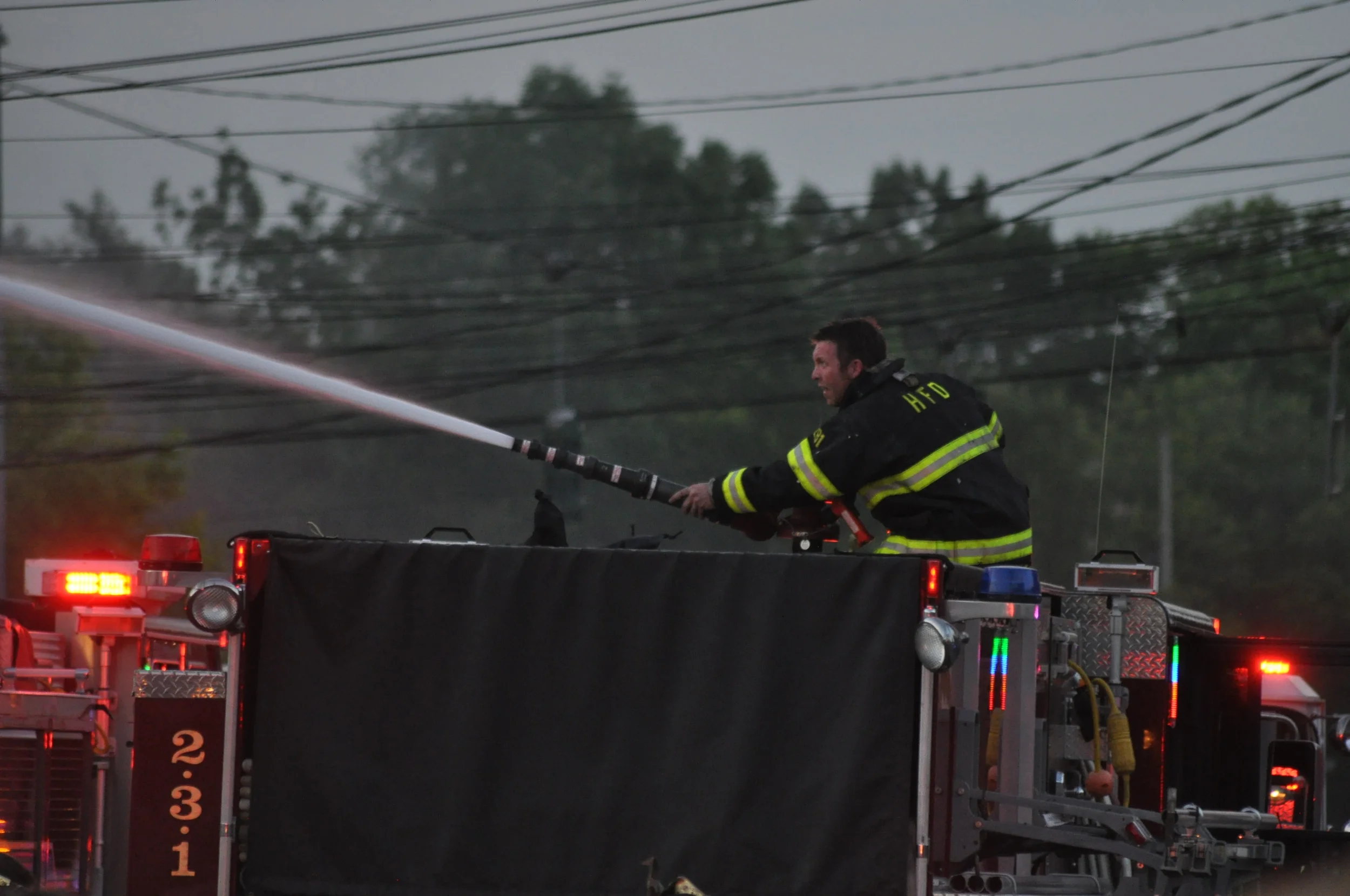 The fire appeared to originate from the rear of the office building and quickly grew in intensity. Within minutes, an intense inferno consumed the rear of the building and progressed toward New York Avenue as volunteer firefighters scrambled for position to attack the blaze. Firefighters began dousing the flames with a ladder truck at approximately 8 p.m., as police officers on the ground moved curious spectators away from the growing blaze.