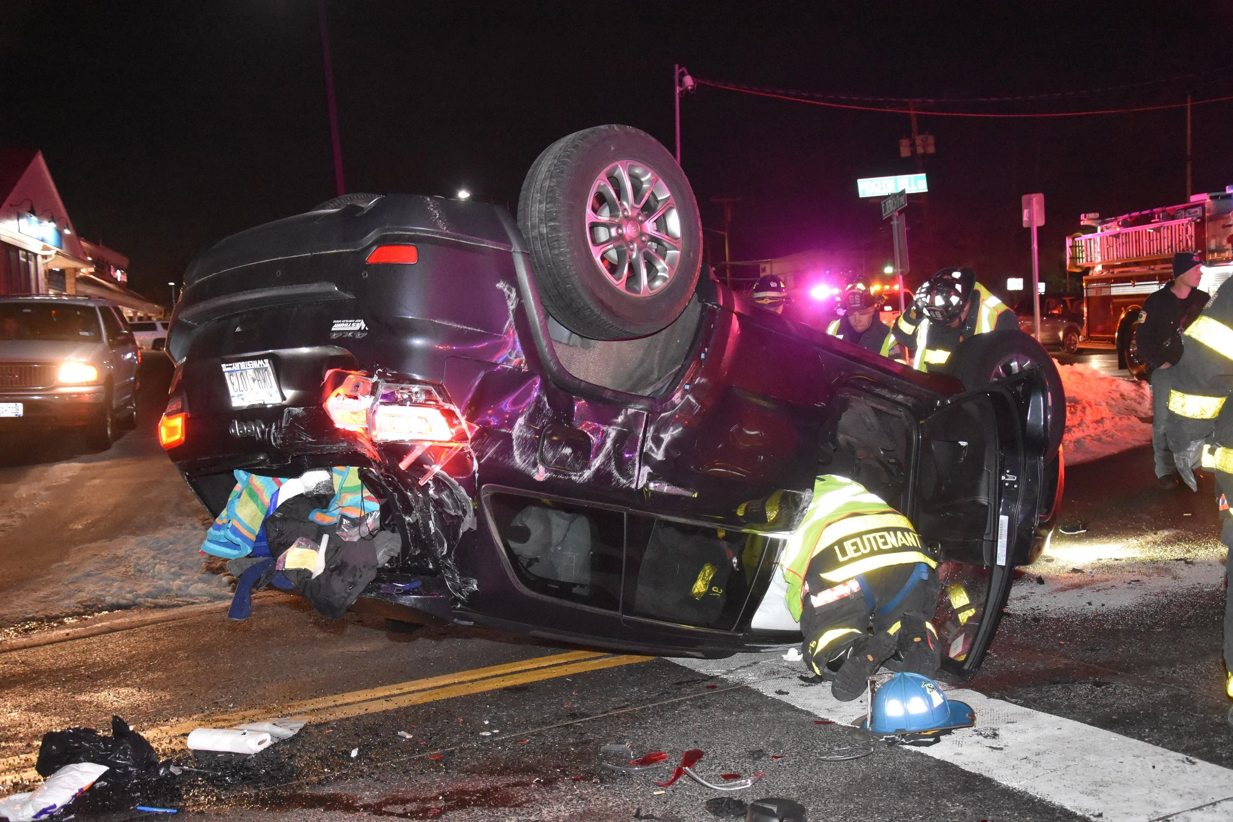 /An overturned Jeep rests on Jericho Turnpike following a three-vehicle crash on Jericho Turnpike on Tuesday.