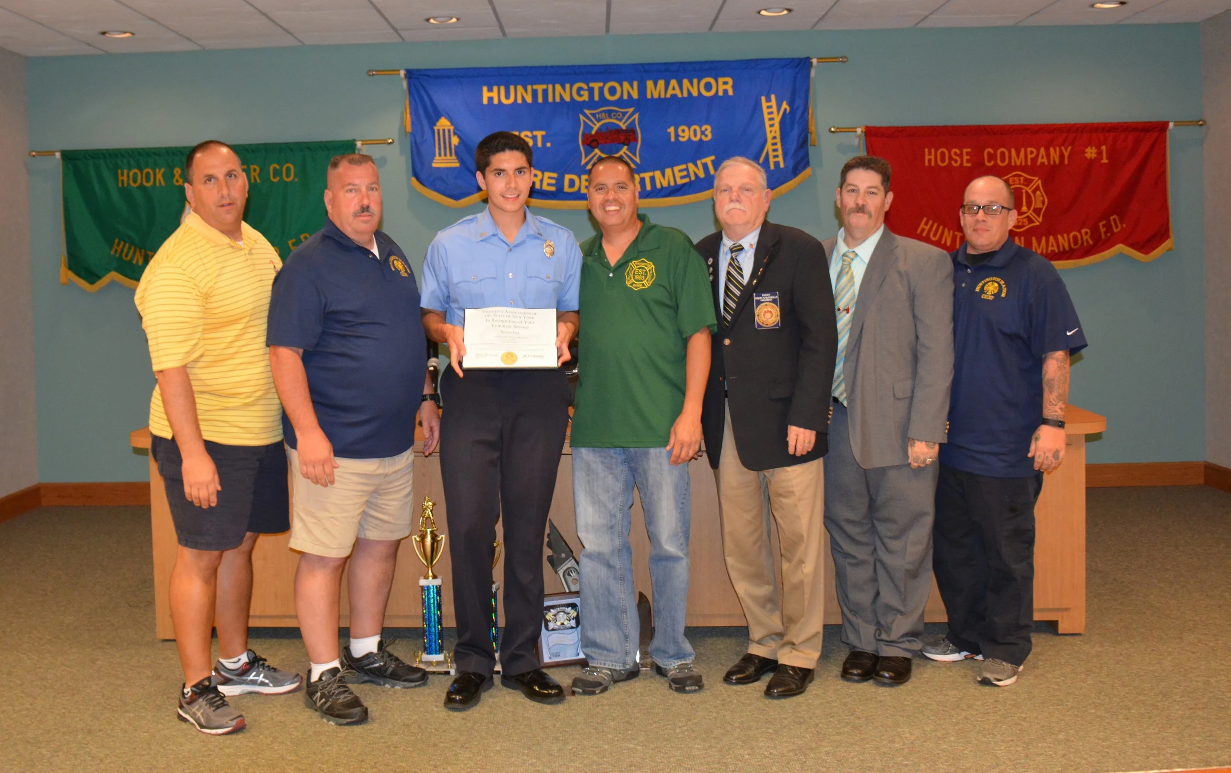 Bob McConville, president of the Firemen’s Association of New York, recently presented the Gerald J. Buckenmeyer Volunteer Scholarship Award to Eng in recognition of his dedication as a Huntington Manor junior firefighter.