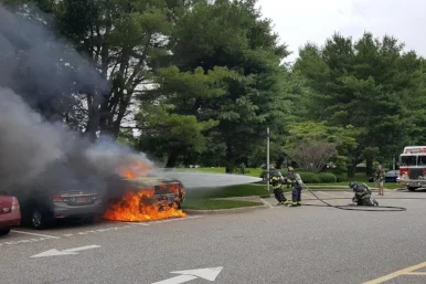 Firefighters battle a car fire on the Long Island Expressway in Dix Hills on July 4.