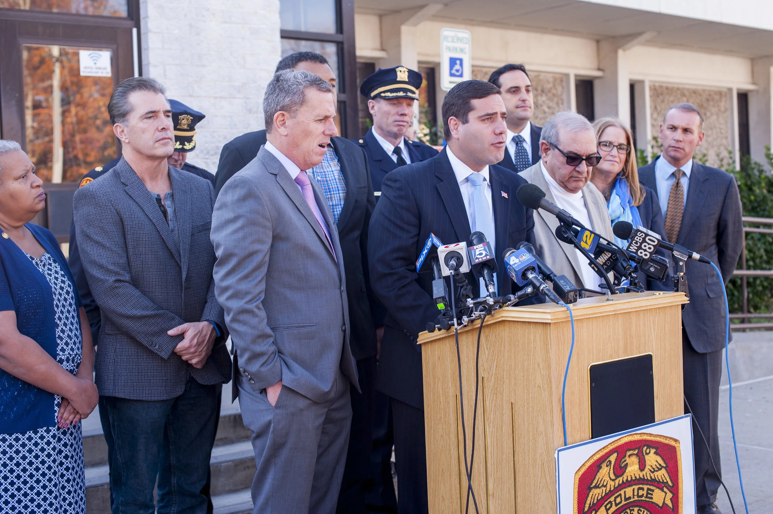 Suffolk Police Commissioner Timothy Sini gathered with a delegation of local officials to announce reductions in Huntington Station crime as a result of a months-long initiative to curb violence in the area.