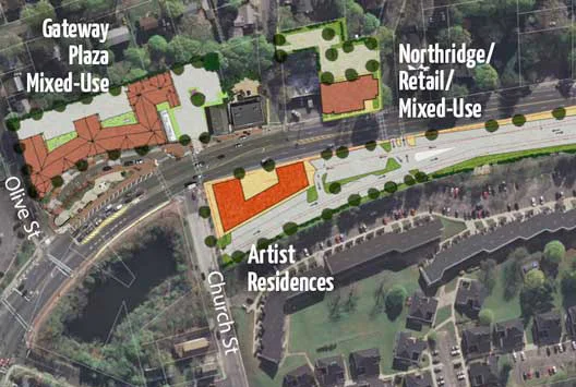 Renaissance Downtowns’ Northridge Street development is depicted on a map next to one of the master developer’s other projects, Gateway Plaza, which is also being reviewed by the ZBA. Photo/Renaissance Downtowns