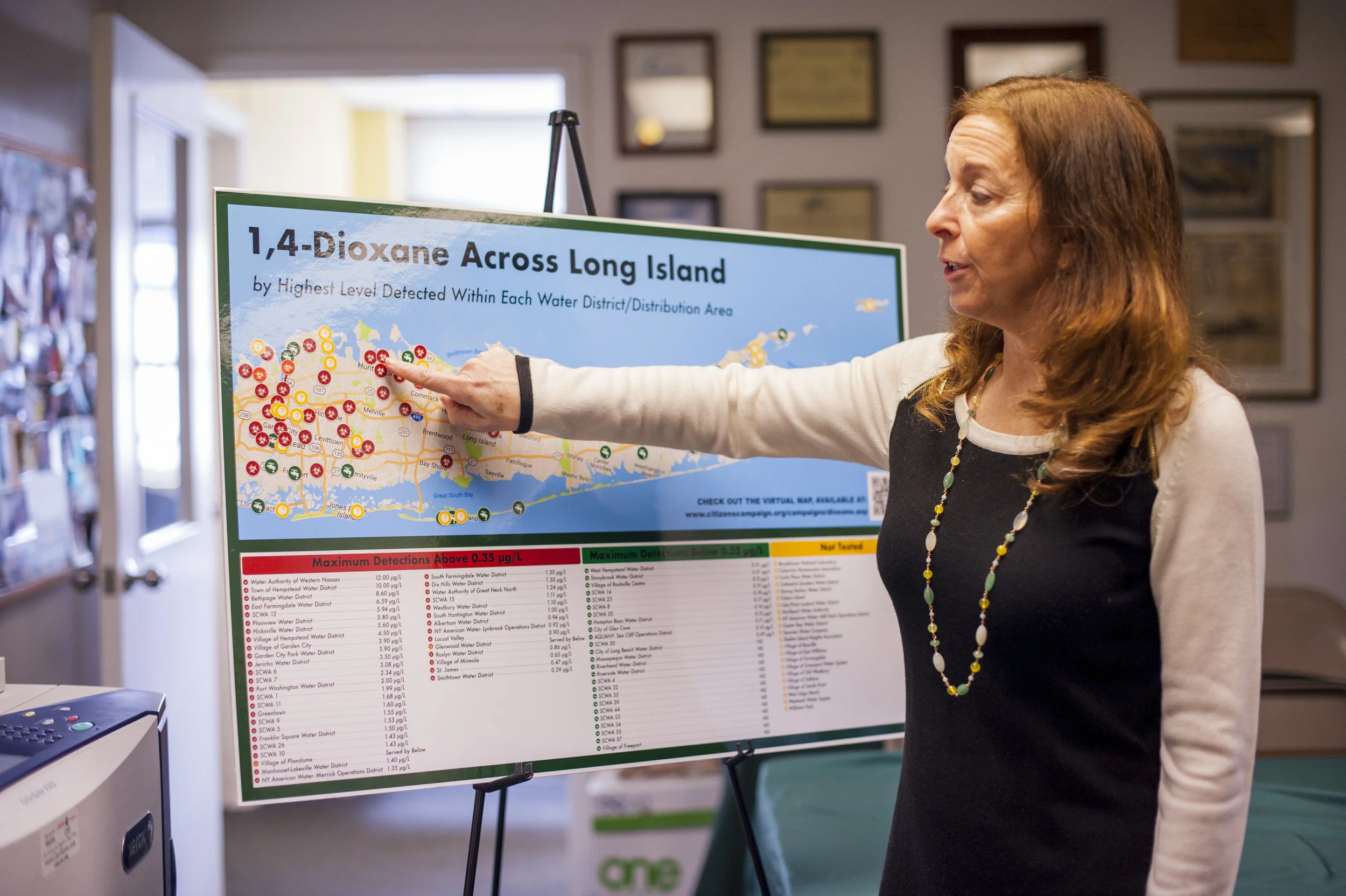 Executive Director of the Citizens Campaign for the Environment Adrienne Esposito points to Huntington and its water distribution points contaminated by 1,4-dioxane, with maximum detections in drinking water that pose potential cancer risks.