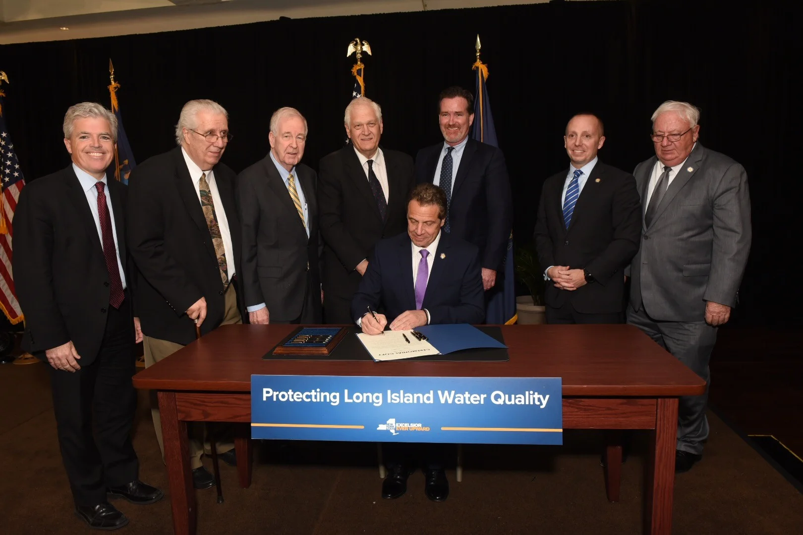 Suffolk Executive Steve Bellone, far left, stands with officials as Gov. Andrew Cuomo signs the Clean Water Infrastructure Act, which includes a provision to create an advisory body that aims to regulate emergent contaminant 1,4-dioxane.
