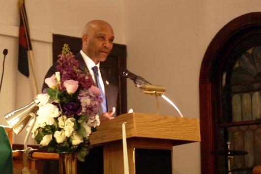 /Suffolk Sheriff Dr. Errol Toulon gives his keynote address Monday night at the NAACP Huntington Branch’s Martin Luther King Jr. Jubilee Program at Bethel A.M.E. Church. Long Islander News photos/Connor Beach