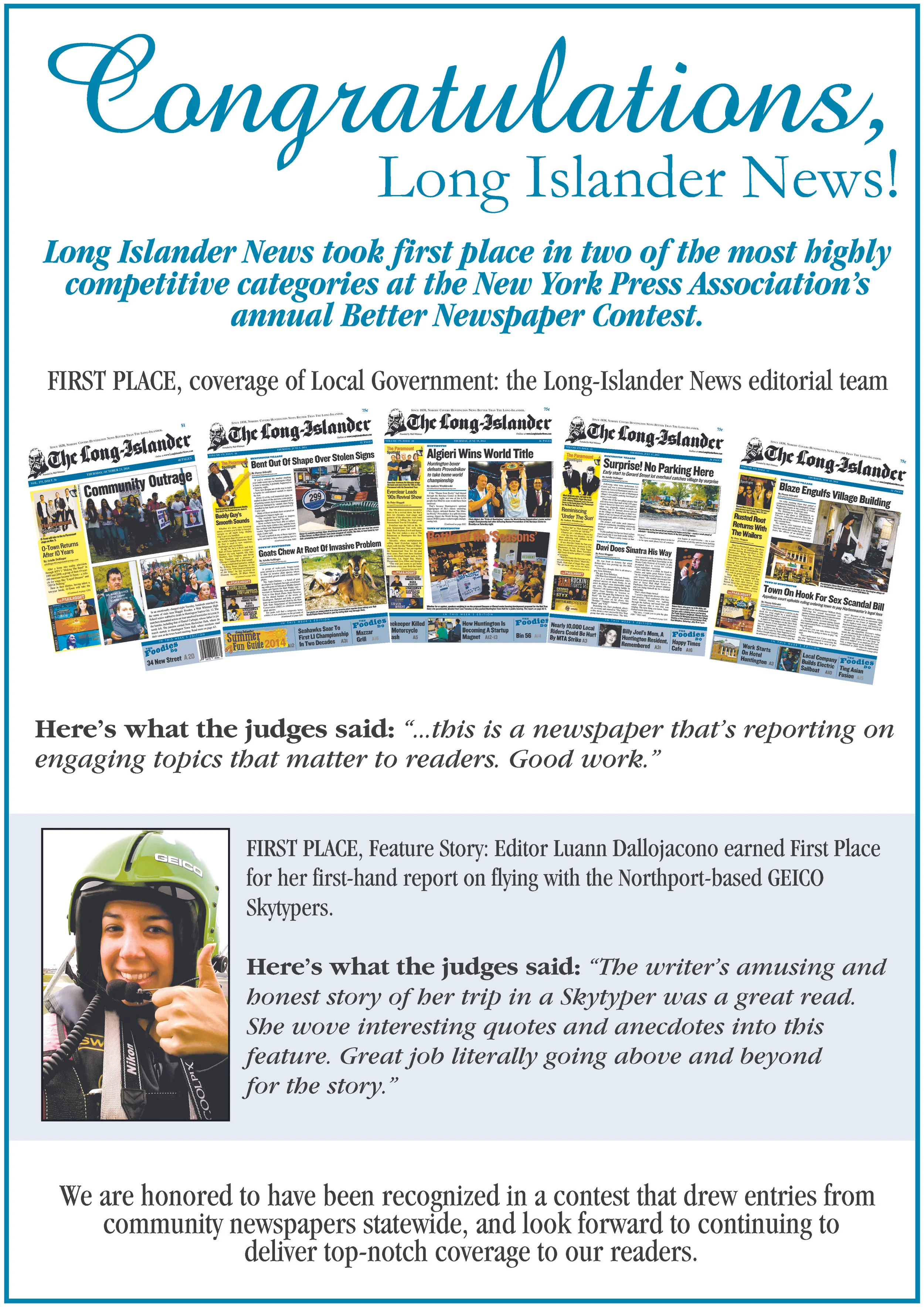 March 31, 2015 We Are Proud To Announce Our "Better Newspaper Contest" Victories! March 31, 2015/ James Kelly
