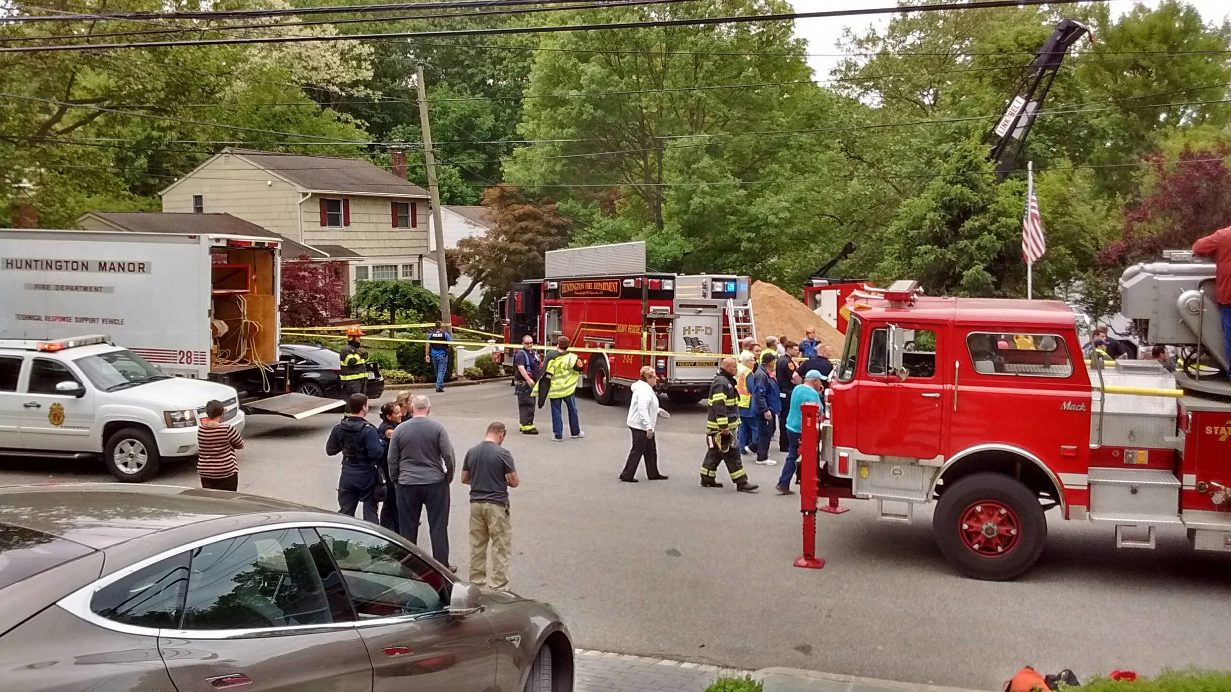 Suffolk County Police Second Precinct and Emergency Service Section officers, Nassau County Emergency Service officers, members of Huntington Community First Aid, and Dix Hills, Greenlawn, Huntington and Huntington Manor fire departments, as well as officials from the Town of Huntington and Occupational Safety and Health Administration, responded to the scene.