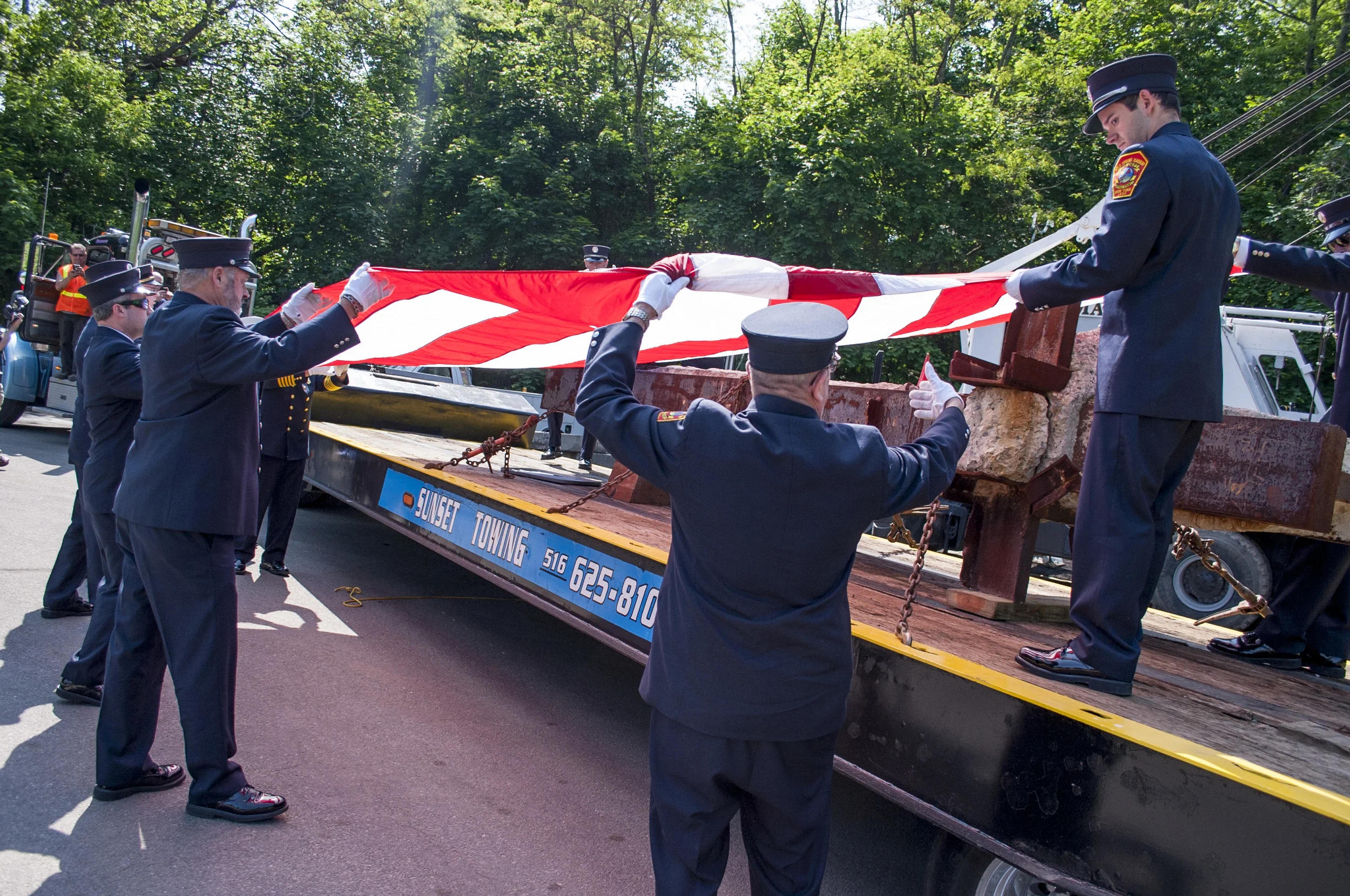 At the recycling facility, firemen lifted the flag covering the steel, while the sound of bagpipes rang in the background. Town of Huntington Councilman Eugene Cook, who attended the ceremony, thanked the fire department officials for all their work.