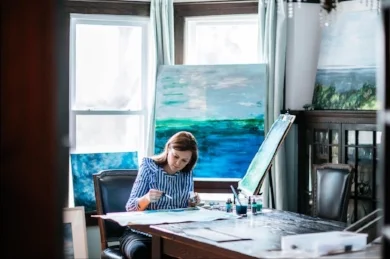 /Grainne de Buitlear, at work in her studio, is exhibiting with fellow painters Jean Cohn and Michael Ricigliano in Beyond The Sound at Huntington Arts Council’s Main Street Gallery