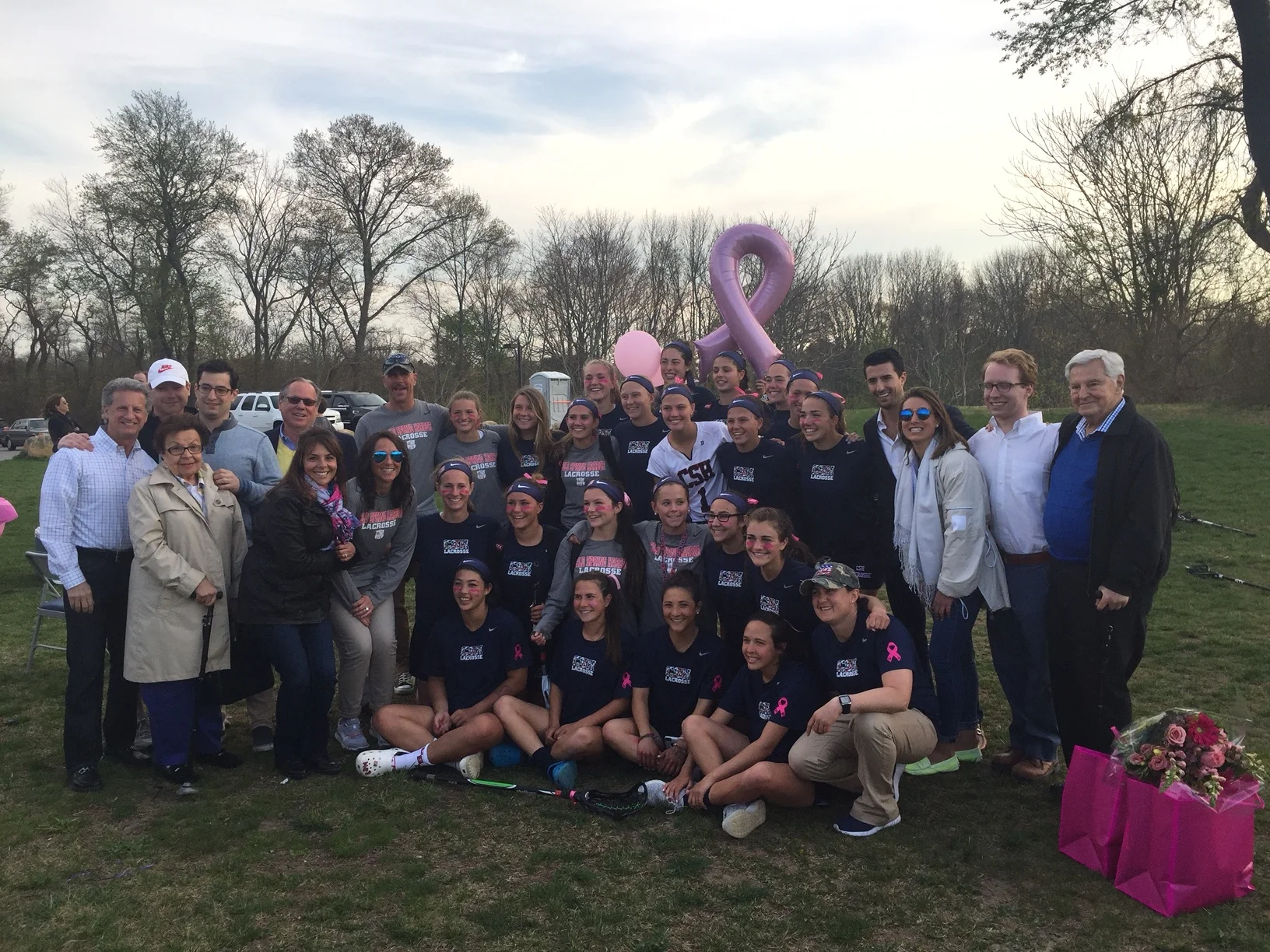 With the initials “N.G.” and a breast cancer symbol stitched on the sleeves of their warm up shirts, and pink ribbons dangling from their hair and cleats, the Cold Spring Harbor girls lacrosse team honored the late Niki Gregory, a former longtime team supporter who died last October. Gregory, 62 at the time of her death, was a cancer survivor for nearly three decades.