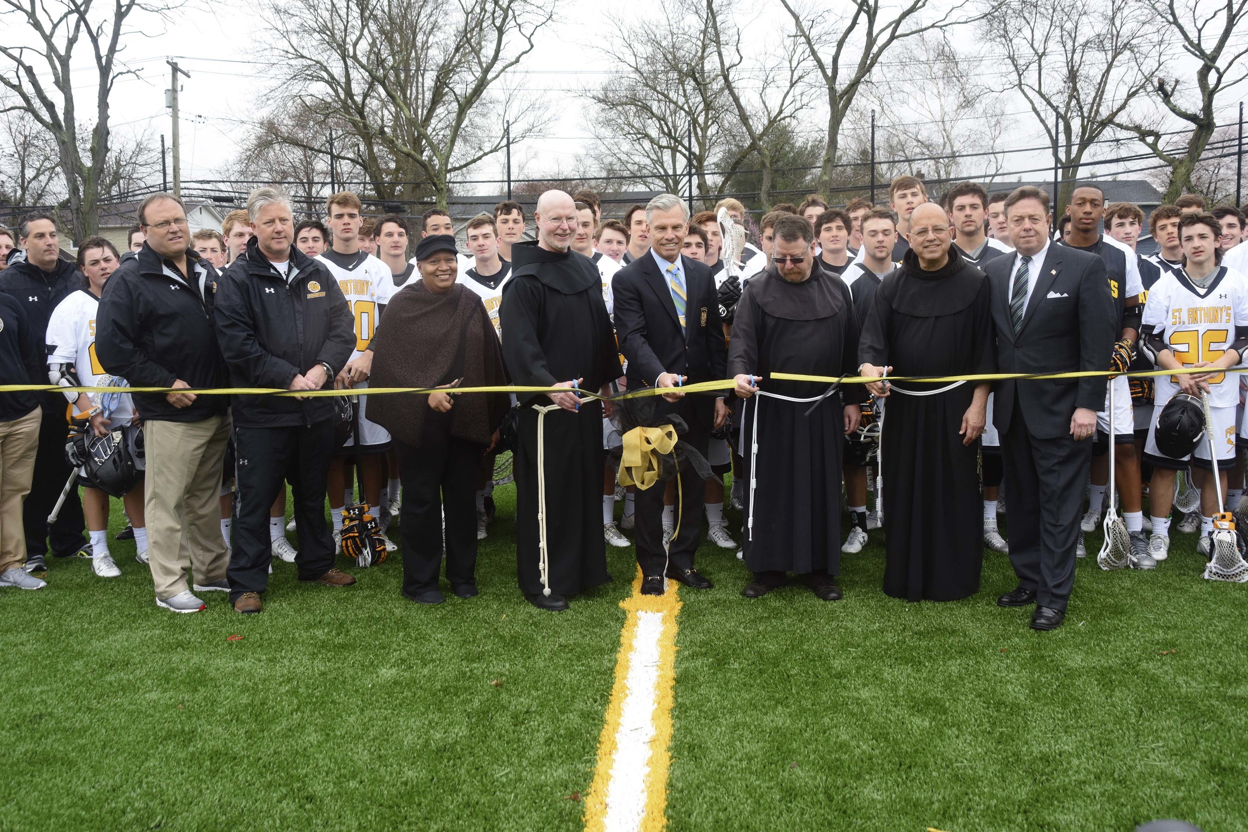 Among those who cut the ribbon at St. Anthony’s High School’s newly-unveiled James C. Metzger Stadium is James C. Metzger; St. Anthony’s Principal Bro. Gary Cregan; Bro. Christopher Thurneau, OSF; Director of Development Don Corrao; Huntington Councilwoman Tracey Edwards; and school administration, lacrosse coaches and members of the varsity lacrosse team. Photo/Ray O’Connor Photography