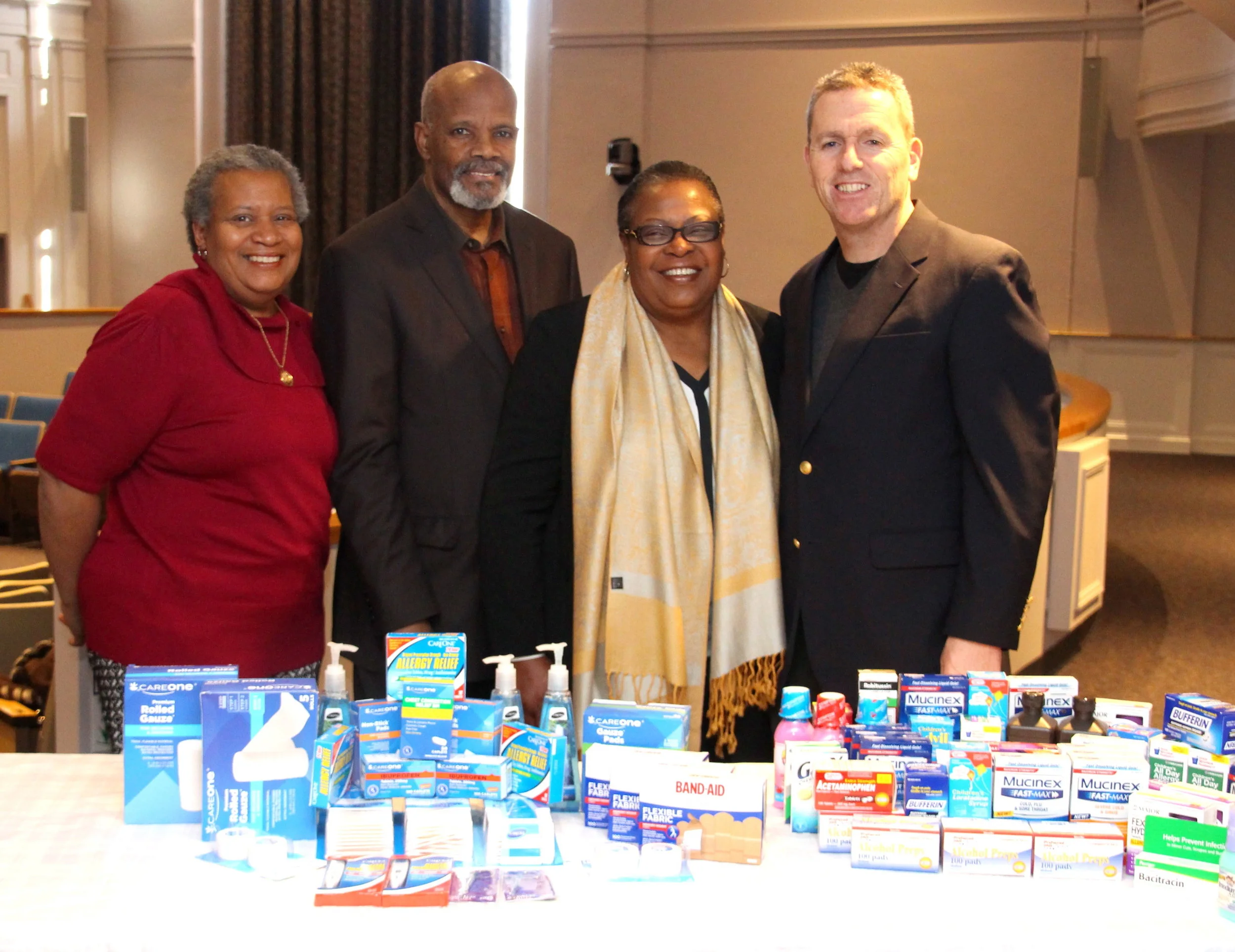 Councilwoman Tracey Edwards, far left, and Councilman Mark Cuthbertson, far right, with Pastor Georges Franck, Ginette Rows and some of the medical supplies donated by the two Councilmembers, along with items that were generously donated by 110 Pharmacy & Surgical in Melville.