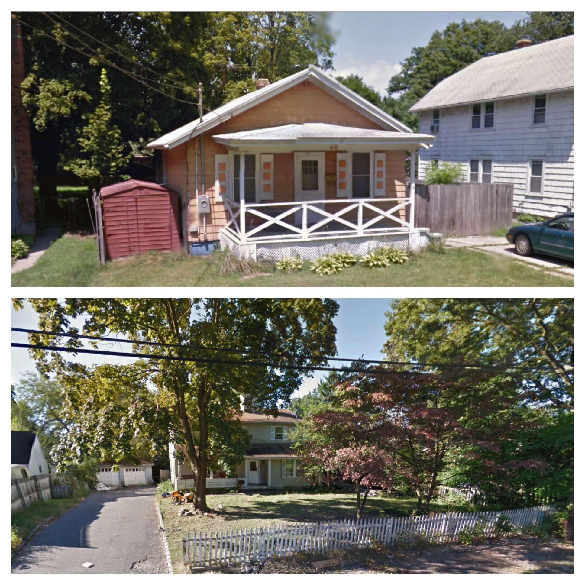 /Two Huntington Station residences, 104 W. 21st St., top, and 46 E. 12th St., bottom, have been hit with a total of 17 summonses after a search warrant uncovered illegal apartments and town code violations, according to Town of Huntington officials. Photos/Google Maps